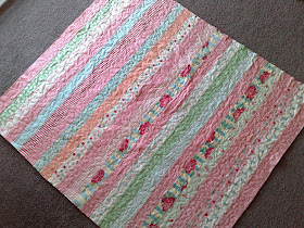 This is the little cot size quilt from earlier in the week that I was putting together made with jelly roll strips. I FMQ'd this one yesterday and now it is in the ready to bind pile.